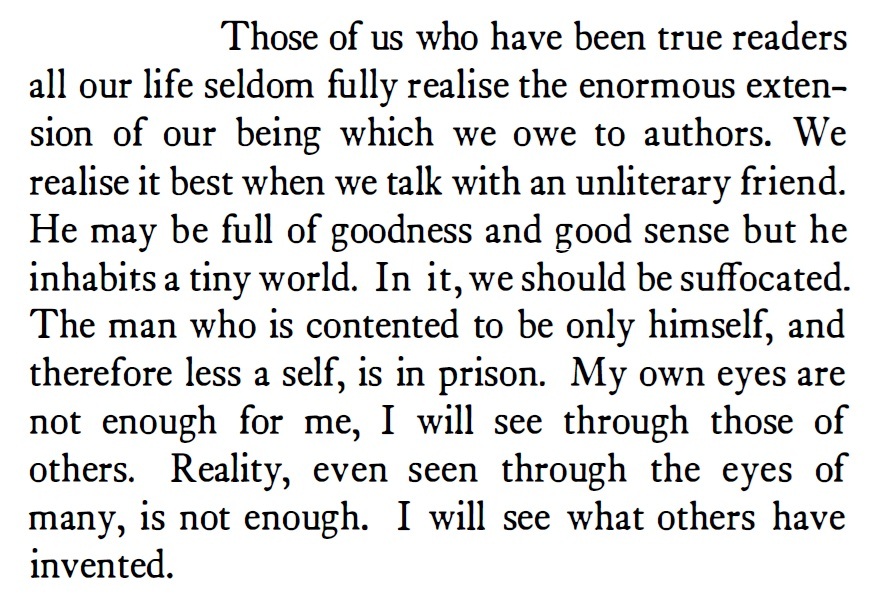 Aquellos de nosotros que han sido auténticos lectores toda la vida rara vez se dan cuenta por entero de la enorme extensión de nuestro ser que debemos a los autores. Lo entendemos mejor cuando hablamos con una amistad no literaria. Puede estar llena de bondad y de buen sentido, pero habita un mundo diminuto. En él, nos sofocaríamos. Aquel que se contenta con sólo ser él mismo, y por lo tanto con menos ser, está en prisión. Mis propios ojos no me bastan, quiero ver a través de los de otros. La realidad, incluso vista a través de los ojos de muchos, no es suficiente. Quiero ver lo que otros han inventado.